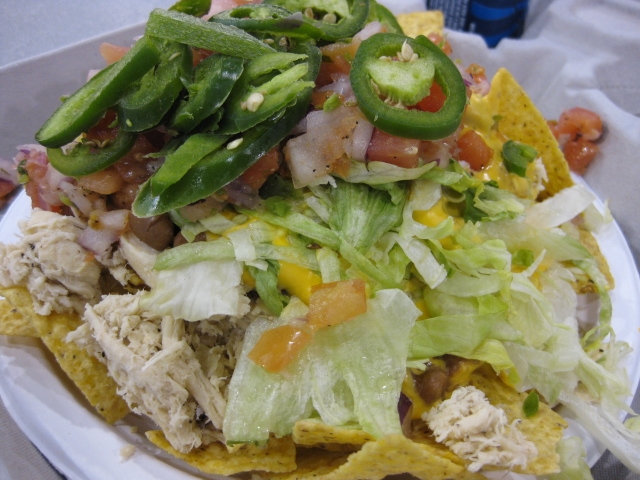 トルティーヤチップスの上に大量のチキン、チリビーンズ、温かいチーズソース、レタス、トマトソース、ハラペーニョが乗って9ドルちょっと。